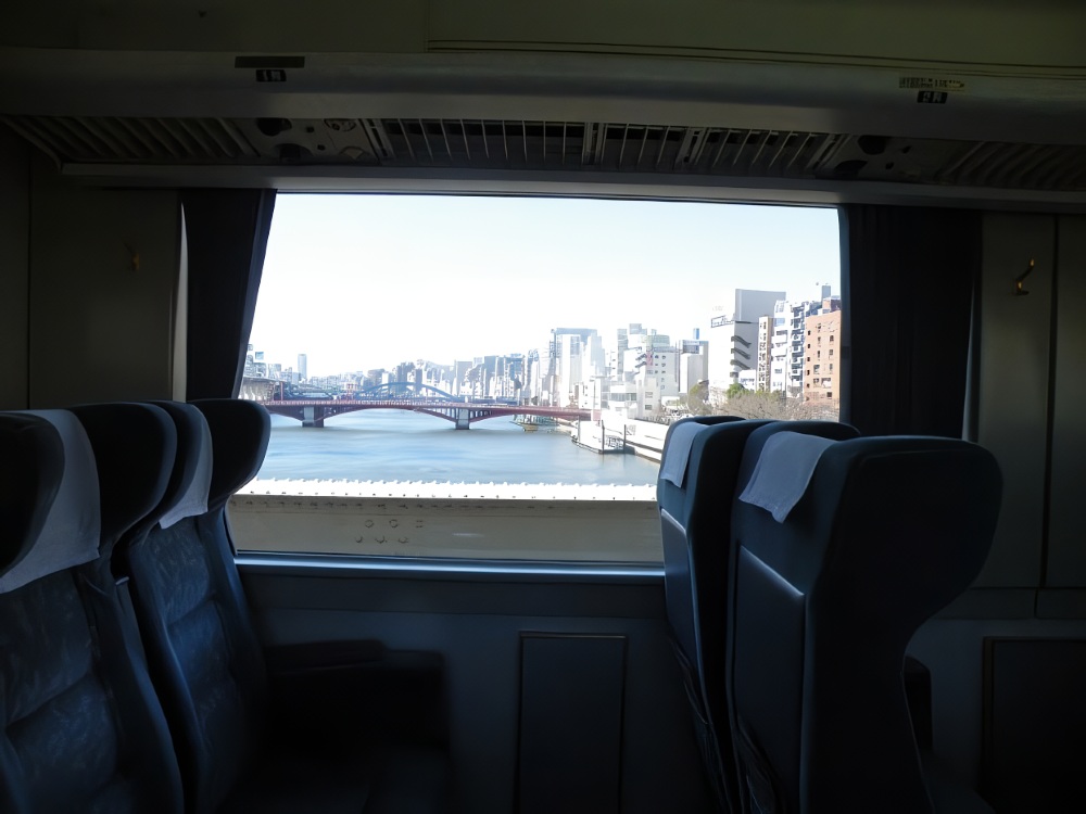 スカイツリーの横を過ぎて業平橋駅を通過し、スピードを落として隅田川を渡ります。