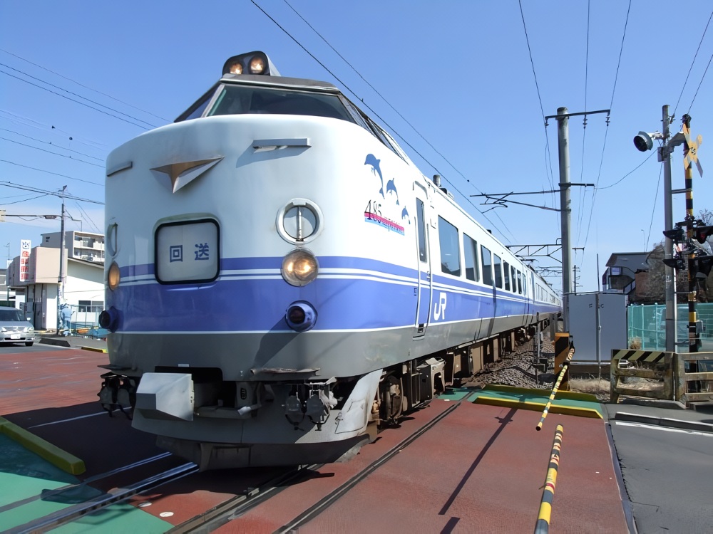 駅前の踏切で引っかかったので待っていると…、なんとイルカ色の485が!!🐬