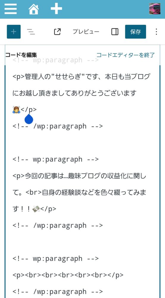 今書いてるこの記事も、基本的には文字を打ち込むだけですが…段落などをいじる時はコードエディターからこういう画面を出し、色々修正したりするので覚えるのに時間が掛かりました…💦