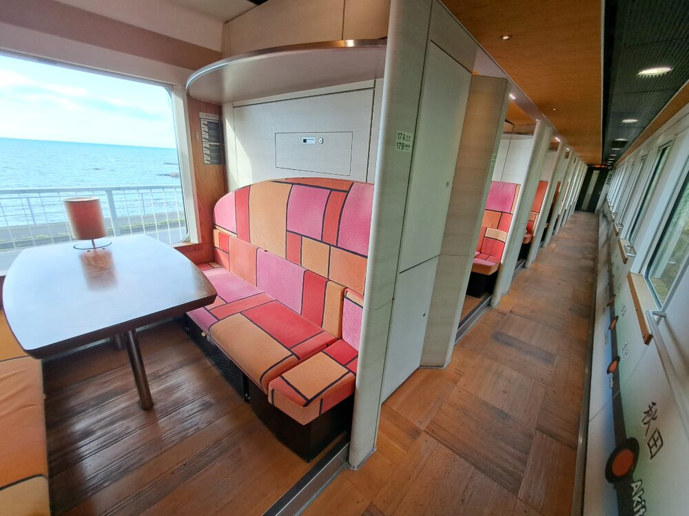 3編成とも内装が異なり、この橅編成はカラフルな座席に物販カウンター(現在は非営業)、そして海側を向いて座れる椅子&テーブルも。