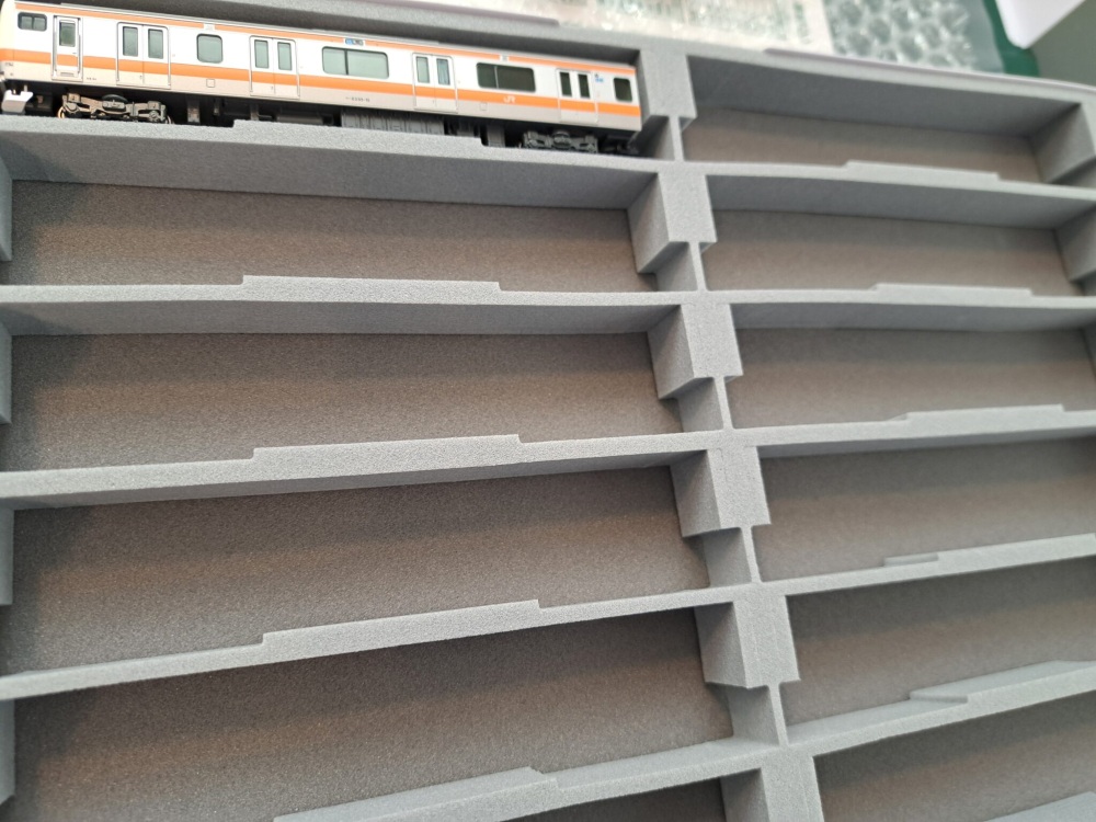 いつもお世話になっているキャスコさんのウレタンを使って、1編成を1ケースにまとめます。