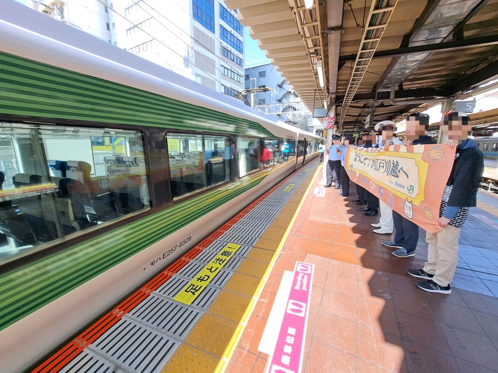 ホームでは幕を持った方々&芋のゆるキャラの人形がお出迎え♪✨