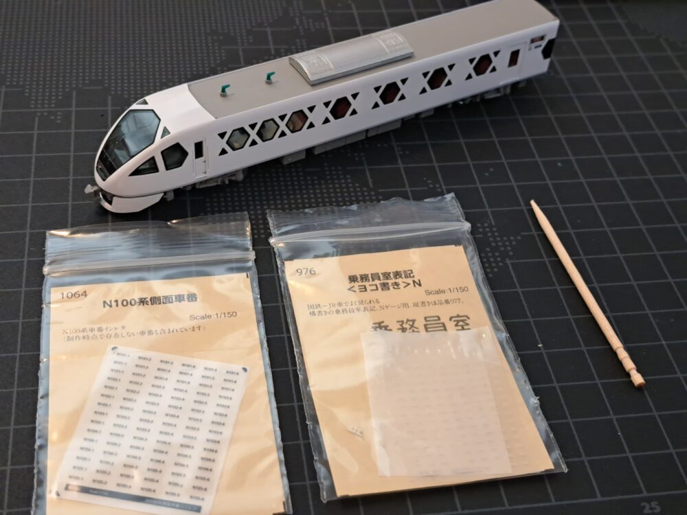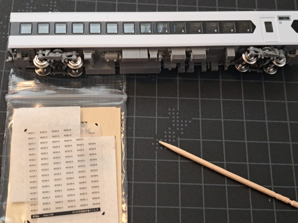 まずは側面に、車番&乗務員室扉のインレタを貼り付けます。