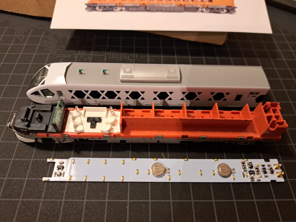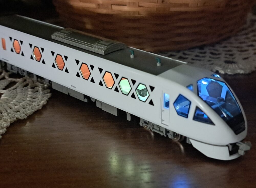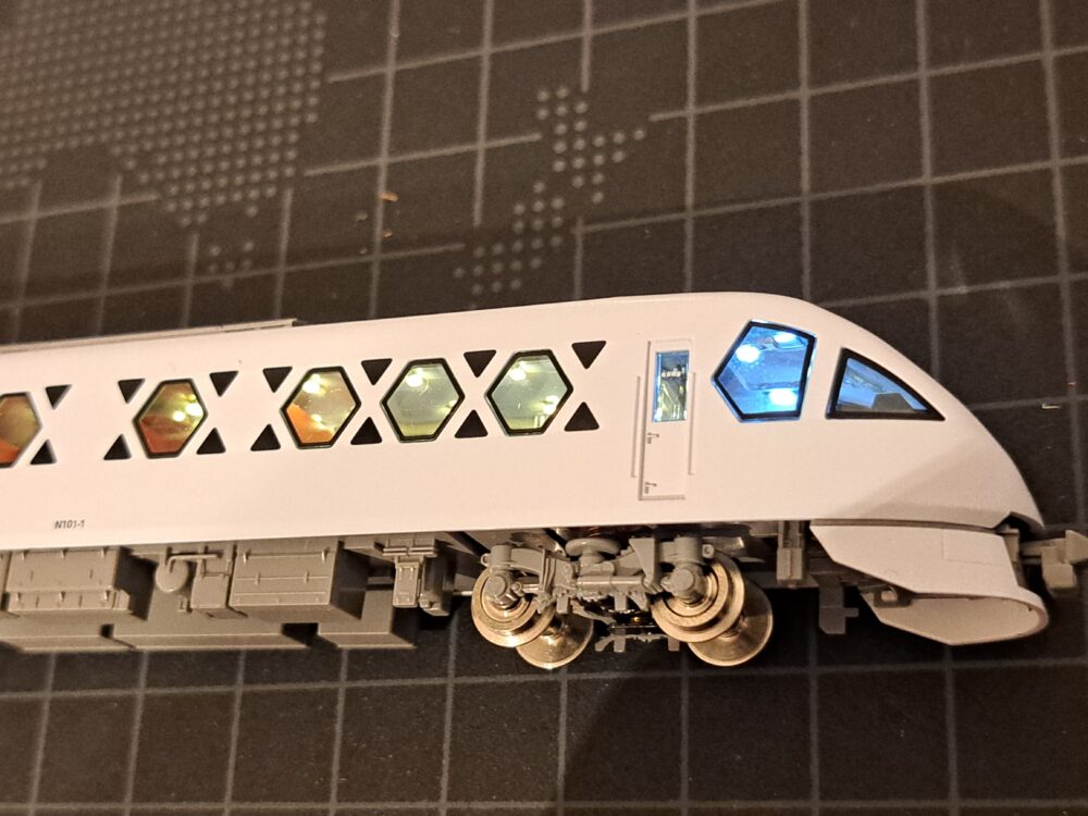 先ほども書いた通り、1両(コックピットラウンジの車両)の室内灯が壊れてて点かず…気付いた時には購入から時間も経っちゃってましたし、ちょうどこのDENSHA.meさんの蓄電池室内灯が気になってたので購入してみました!