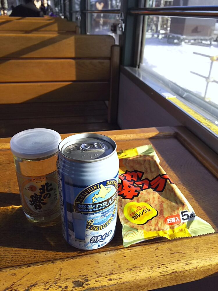 そしてビール&おつまみで呑み鉄しながら知床斜里へ戻ります!🍺