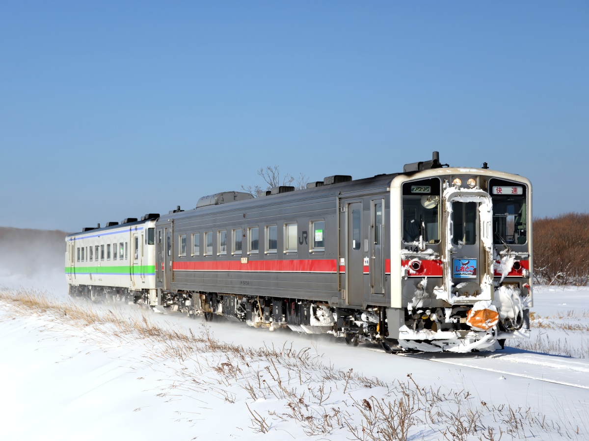 予定変更しノロッコ1号をさっきのストレートで撮って逆アンで4号を…と思ってたんですが、背後に雲が広がって来たので浜小清水へ移動する事にします。