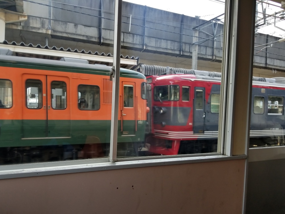 待合室で電車を待ってる間に、反対ホームにさっきの湘南色+しな鉄色コンビが。