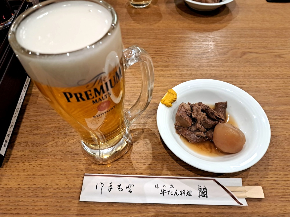20分ほど並んだものの無事に入店でき、まずは乾杯~🍻 お通しで牛スジが出てきてゴージャス!