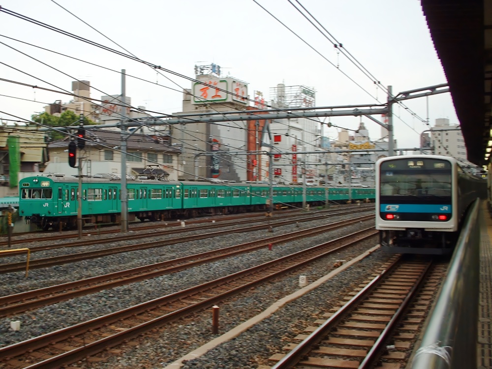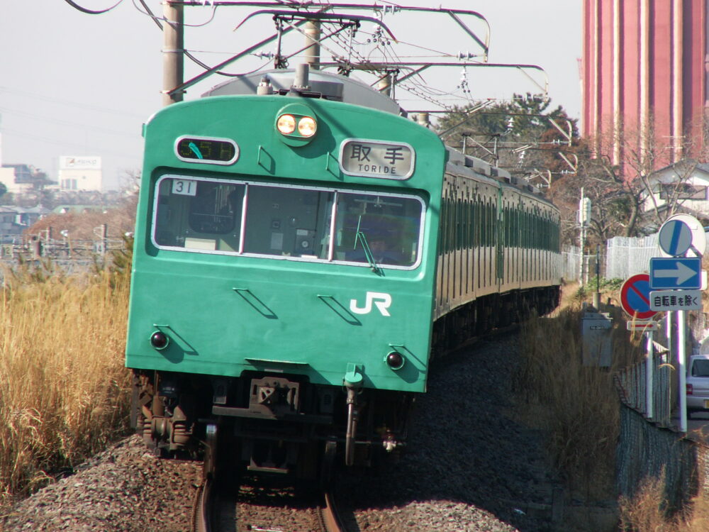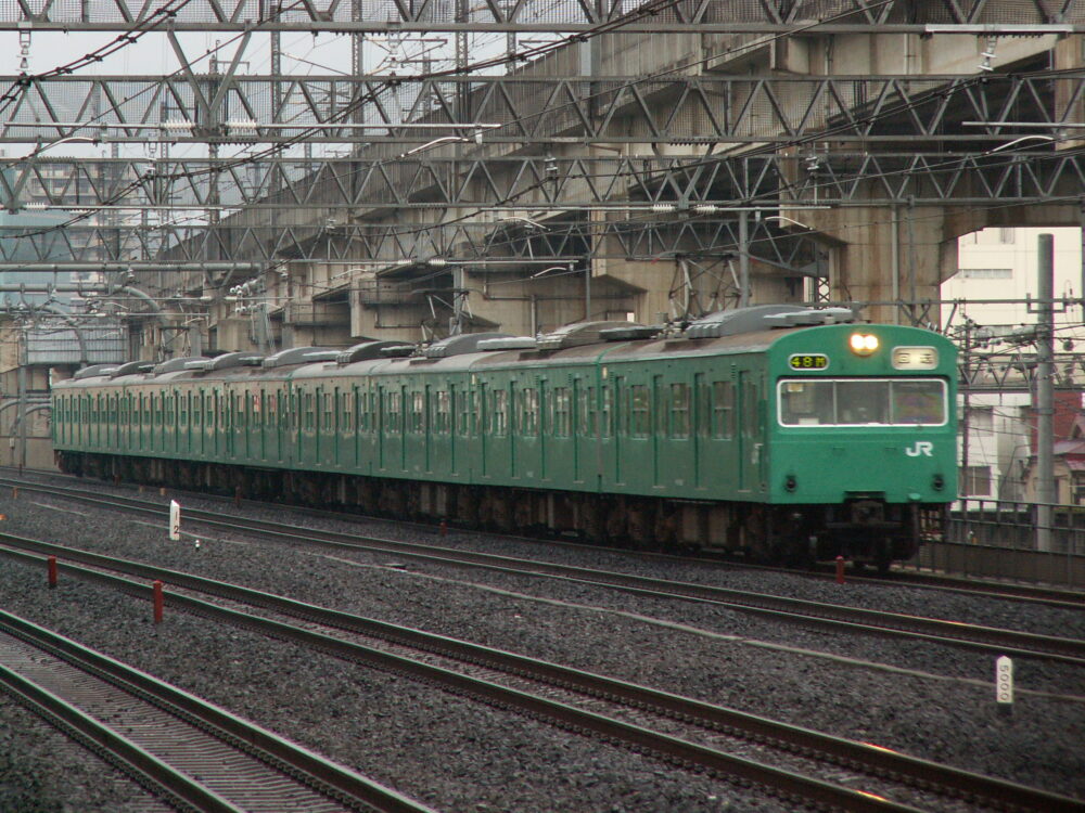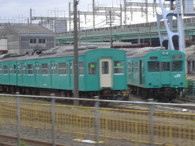 ヒガジュウを行く緑の103系…斬新な光景でした。
