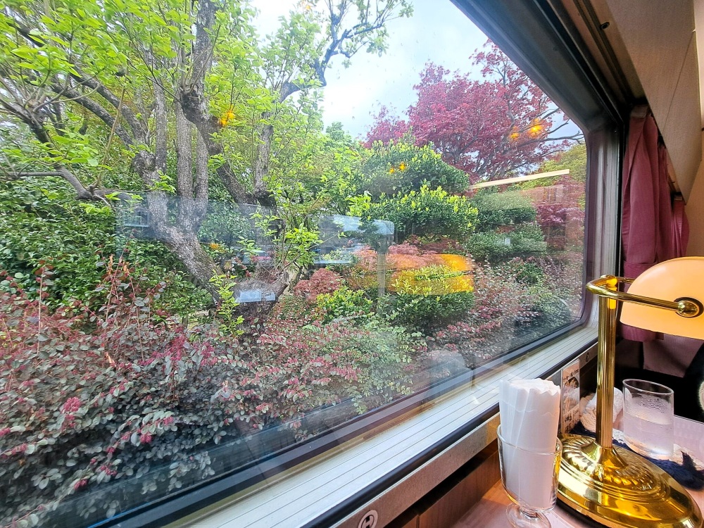 4人テーブルの方は車窓が駐車場と道路になってしまうのですが、2人掛けの方は庭園に面しております。