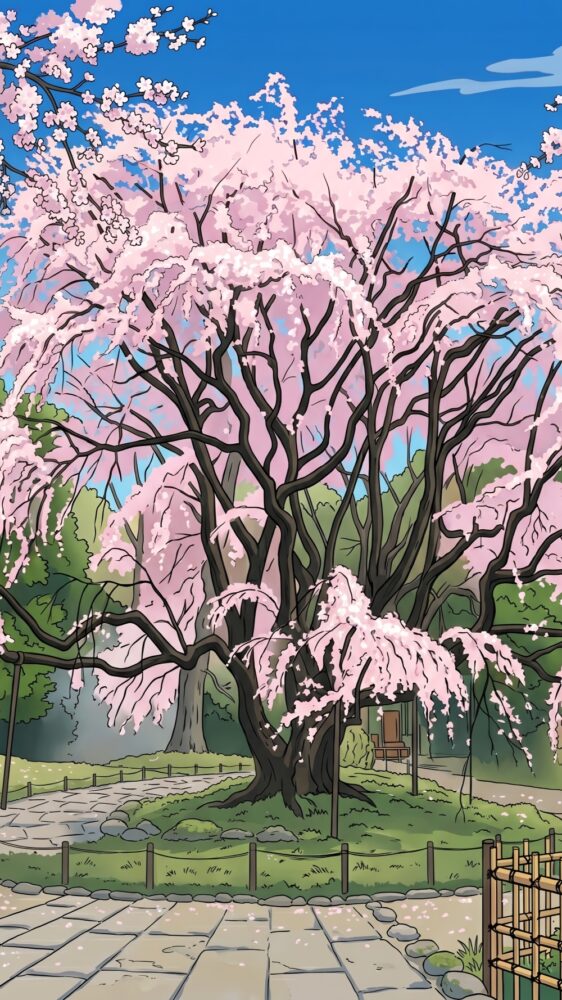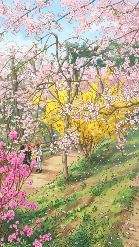 イラストの背景としてキャラクターを置きやすいよう、実際の風景よりも桜の量が増えたり配置物が変わったりしてる場合があります。