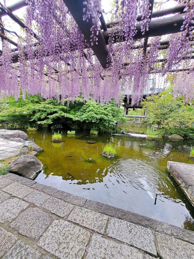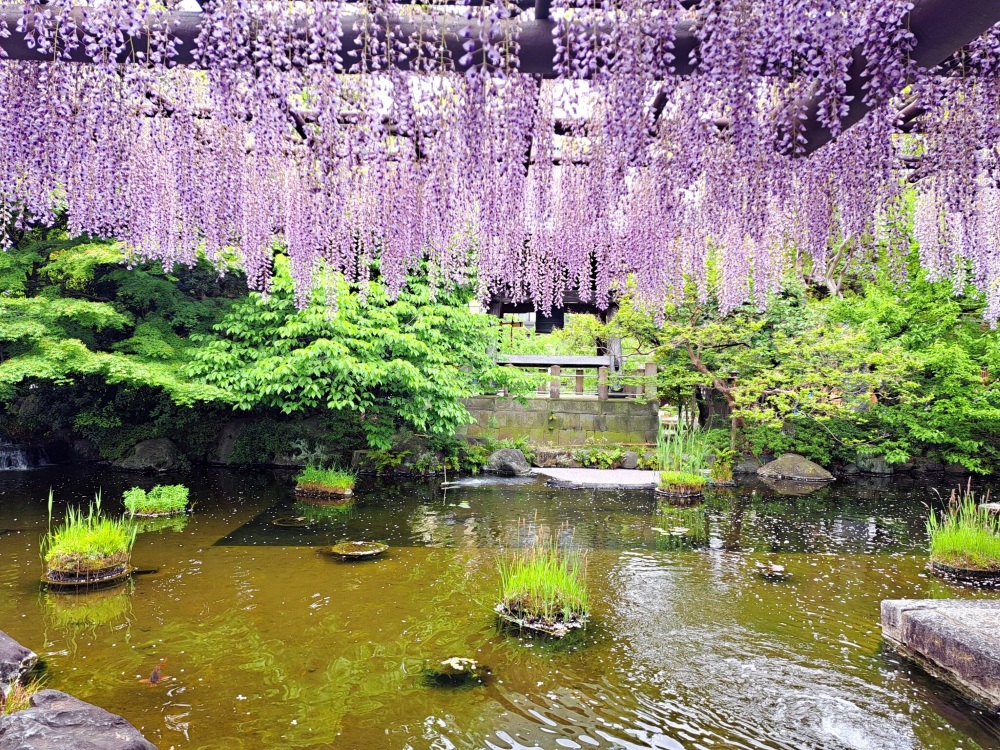 池の周りに垂れ下がる藤が水面に映り込む様子は、ずっと眺めていられるほど幻想的。